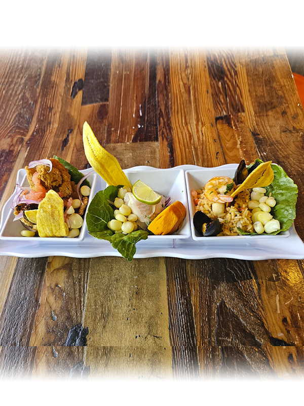 Fresh fish and seafood marinated in lime juice, Peruvian spices and herbs. Served with glazed sweet potato, corn on the cob and dried crunchy corn kernels.